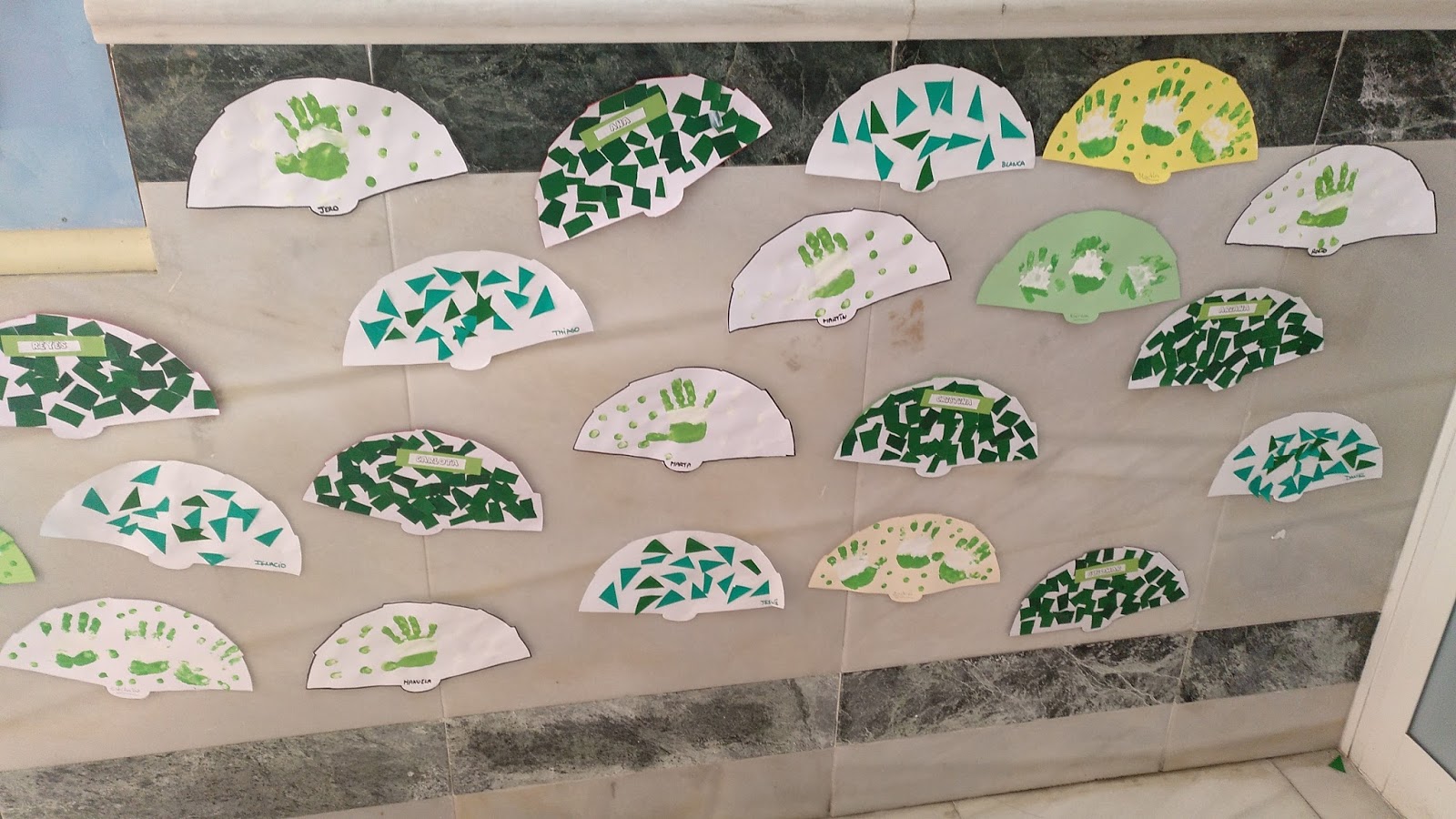 Y para decorar la entrada de la Escuela cada clase hizo unos abanicos que decoramos. En nuestra clase con papelitos de papel charol que los pegaron y luego les puse unos cartelitos simulando la bandera verde, blanca y verde.